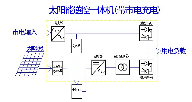 主用于光伏給電池充電,市電為互補(bǔ)充電。